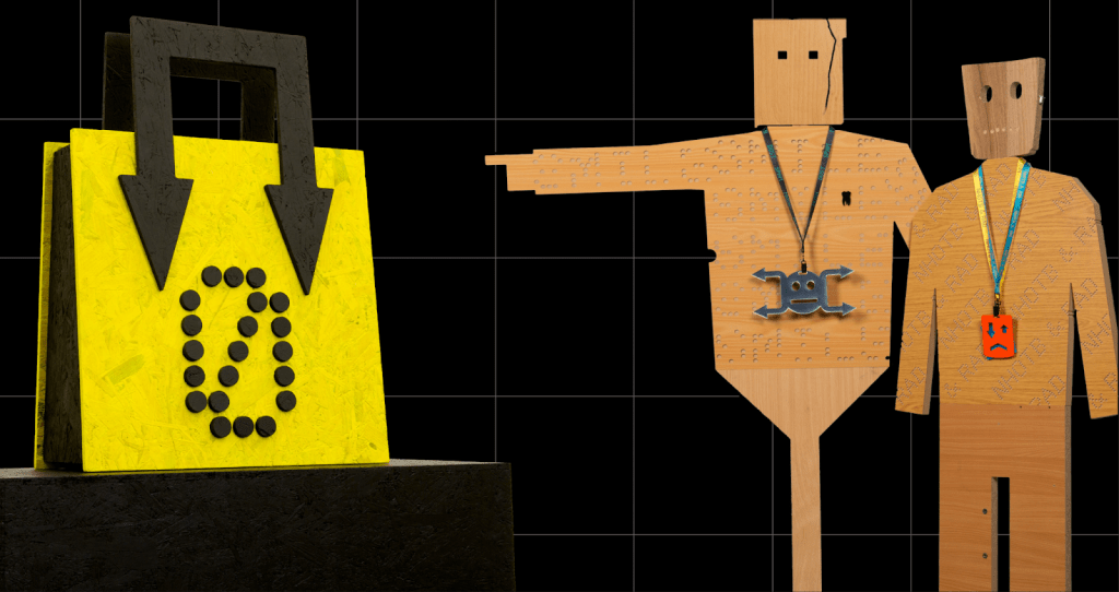 Alongside three collections, a host of 50 life-size figures sculpted from recycled office furniture and reclaimed display materials will activate the space. Each one of these flat pack bodies is unique in its design, materiality and attitude. Many of them have become disaffected and unruly consumers. Digital avatars of these figures also star in a suite of video animations, that play out interlinked scenes alongside animated doppelgangers of the garments.