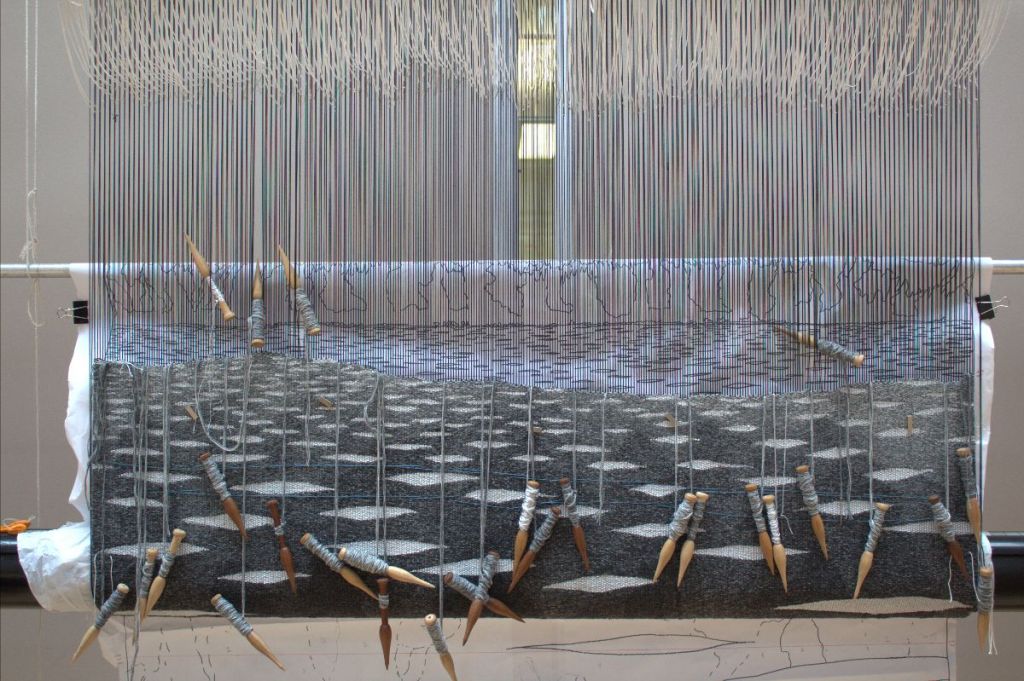 Master Weaver, Naomi Robertson says “We are fascinated to be working with Tania Kovats; to have the opportunity to study the grid, the pattern and perspective in her seascapes and to interpret her work through the natural rhythms of weaving. The tapestry captures her subtle greyscale ink palette in many layers. These include a black warp, many tones of wool, four silvery metals and a high sheen yarn to highlight the reflections of the sea.”
