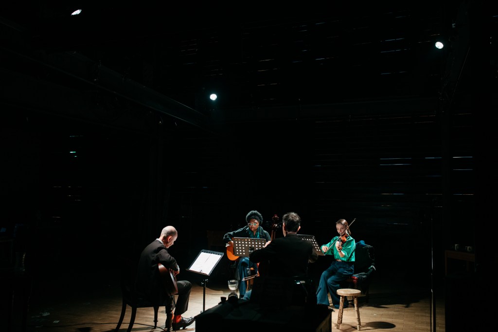 The quartet, made up of Greg Sinclair, Marie-Gabrielle Koumenda, Mia Scott and Nicholas Bone, replace the lecterns towards the end where bass, violin and guitar play Gottes Zeit ist die allerbeste Zeit by Bach and Apphia Campbell sings an unaccompanied version the profound I’d Rather Go Blind made famous by Etta James.