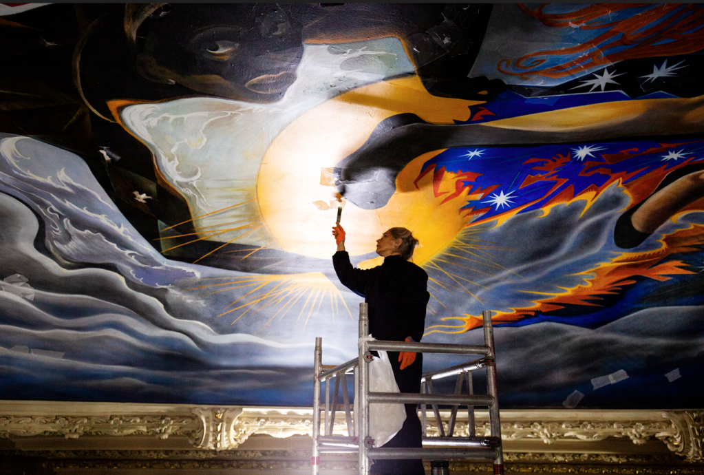Karen Dundas, from Scottish Wall Paintings Conservators, said “It’s a pleasure to be working on John Byrne’s mural in the King’s Theatre dome. I’m sure the coming weeks will try our patience, as we carefully re-adhere each vulnerable flake back onto the ceiling plaster. It’s going to be extremely challenging, but worth the struggle to save this vibrant painting.”